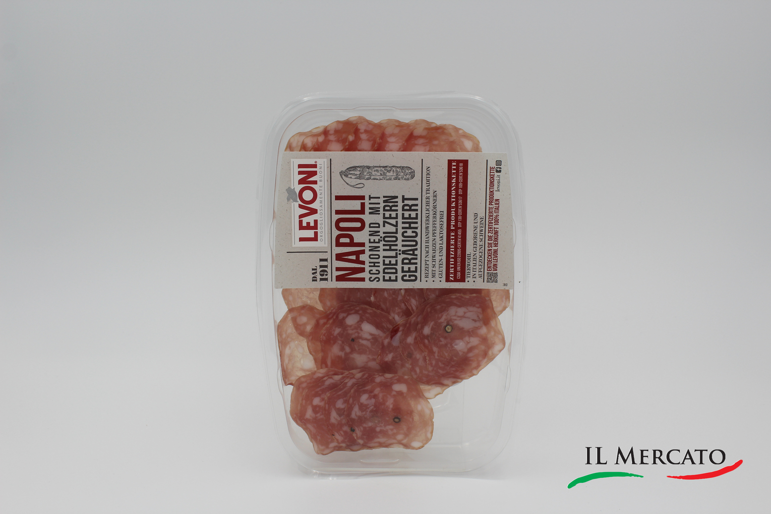 Geschnittene Salami Napoli. Völlige natürliche Würzung nach einer Exklusivrezeptur von Levoni. Hergestellt aus dem Fleisch von Schweinen aus italienischen Zuchtbetrieben.